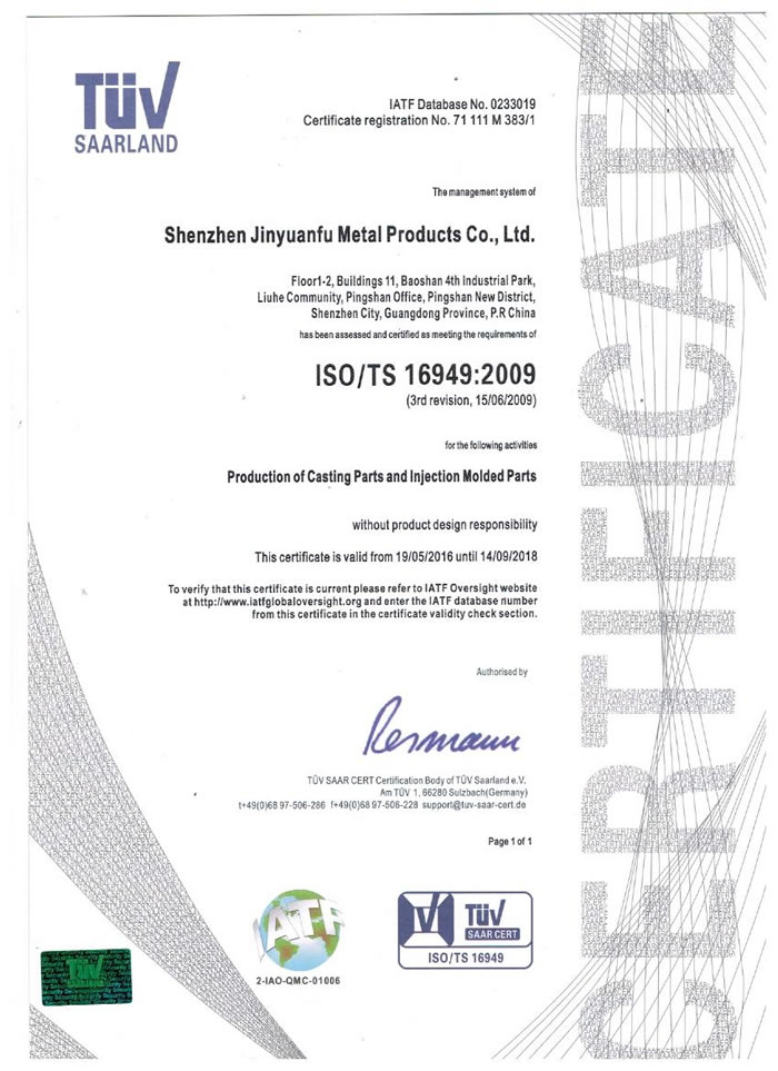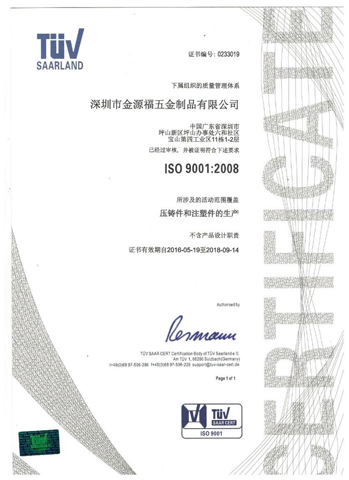 深圳市金源福五金制品有限公司成立于2003年。公司擁有8000多平方米生產(chǎn)廠地、開發(fā)與管理精英人才、技術(shù)專業(yè)、設備精良、交通便利、服務周全、具體設計、開發(fā)、制模、出樣、生產(chǎn)到成品出貨一體化模式生產(chǎn)廠家。已通過ISO9001:2008ISO1440/TS16949:2009國際質(zhì)量體系認證。專業(yè)生產(chǎn)鋅合金壓鑄、鋁合金壓鑄產(chǎn)品、汽車配件、汽車后視鏡支架、車載導航散熱器、LED散熱器、LED燈罩、數(shù)碼電子五金結(jié)構(gòu)件、家具五金裝飾件、標牌(LOGO)等五金壓鑄產(chǎn)品。